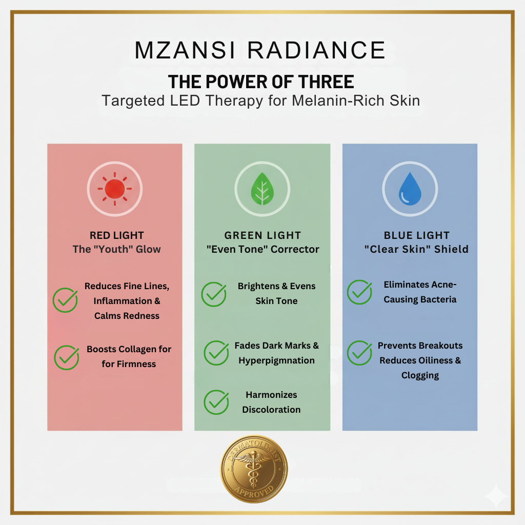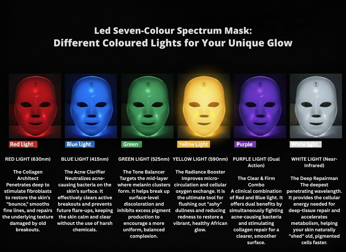 - Yellow Light (590nm): Ideal for removing "ashiness" and boosting that healthy African glow by improving micro-circulation.