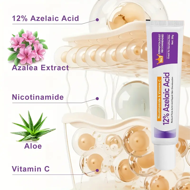 Answer 1: The gel contains 12% Azelaic Acid, Vitamin C, and Niacinamide. Azelaic Acid helps fade dark spots, acne marks, and uneven tone while calming redness. Vitamin C brightens skin and boosts radiance, and Niacinamide strengthens the skin barrier for smoother, more even skin over time.